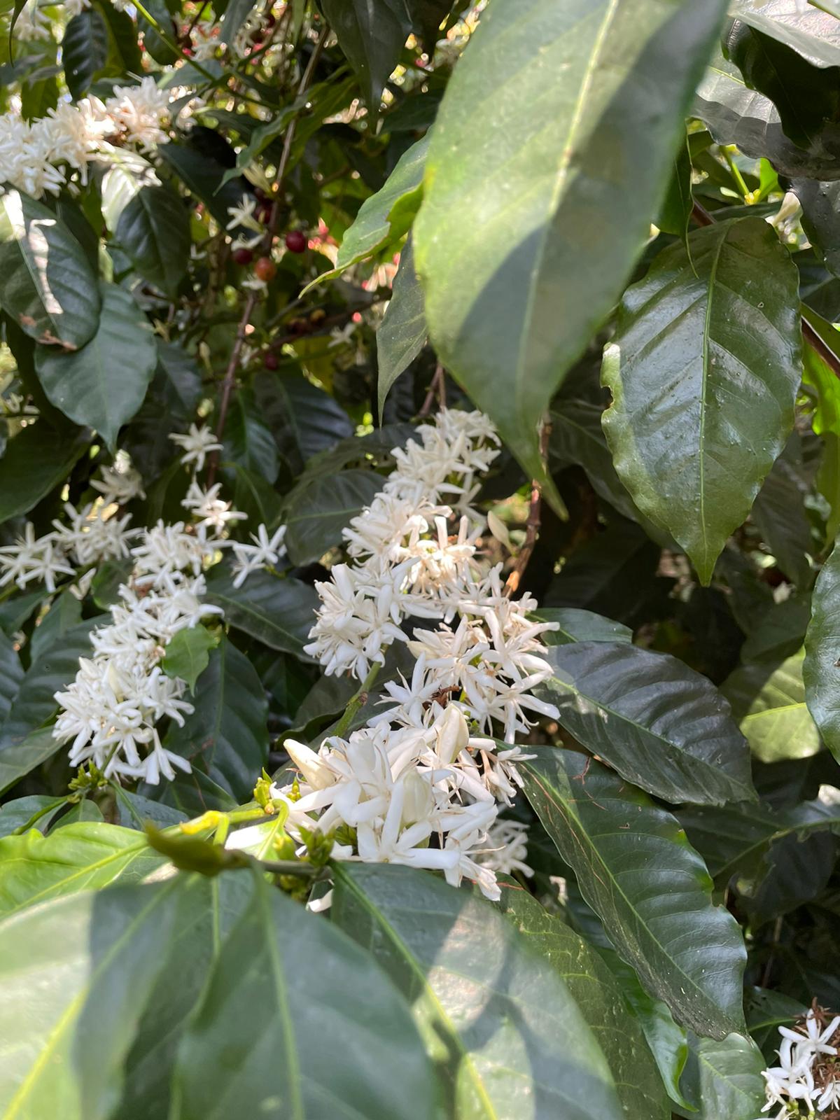 Trees are full of cherries ready to be pick. Constant rain is blamed for a late 2022 harvest. Trees look healthy and well spaced out in rows. Every year the top is cut to keep the plant short. This is done so the pickers can reach the cherry and encourages growth outwards. Some trees have coffee blossoms ready to start growing for next years harvest. This usually take 9 months from blossom to ripe cherry.