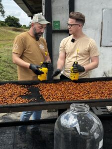 The coffee was then dried in a mechanical dehydrator for 5 days at 36°C operating 24/7. This reduced the cherry moisture to approximately 34%. The cherries where then moved to a silo at 45°C until the beans reached 10-12%.